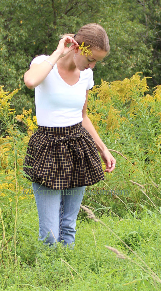 Gathering Apron in Mini Black Plaid 100% Cotton Homespun in Reg and Plus Sizes