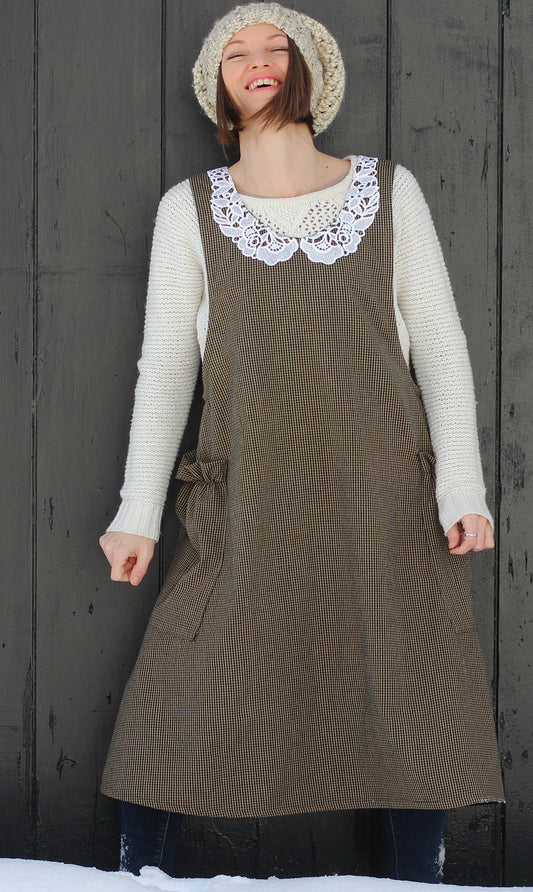 Small 42" - No Ties Crossback Apron in 100% Cotton Tiny Black Plaid Homespun with Lace Collar