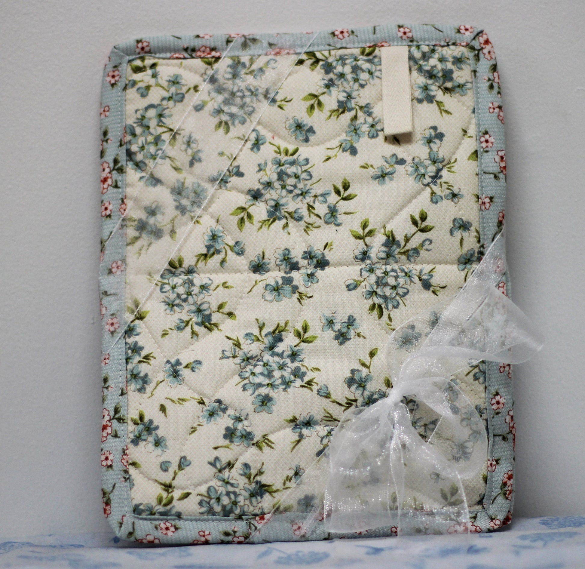 Two plush, pretty Quilted Cotton Potholder Sets. Each side a coordinating print, bound by a pretty third print. They are so pretty! They are machine stitched across the middle making it easy to grasp in your hand and hold it in half. Container three layers of cotton batting. Machine wash and dry.