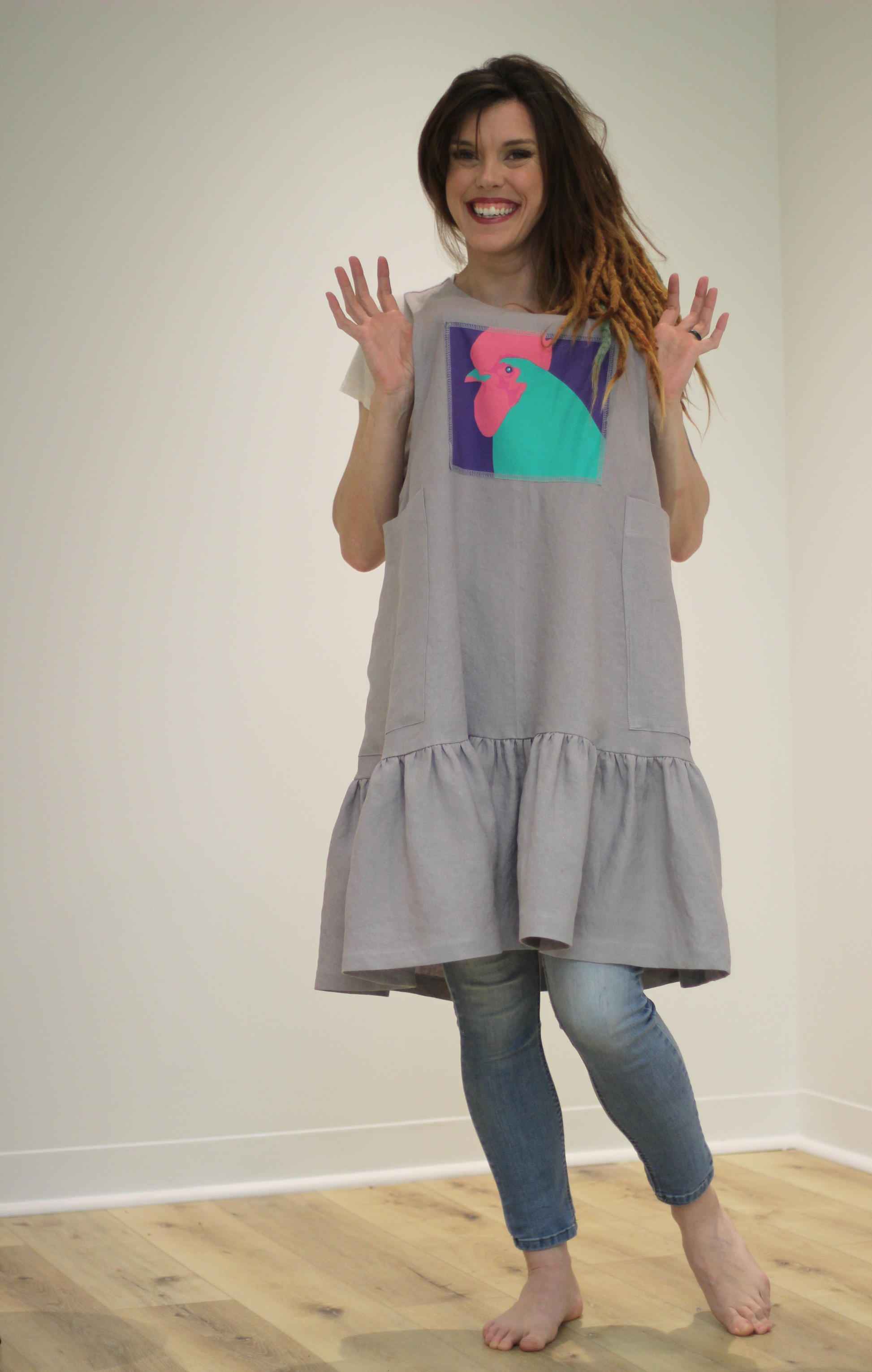 What Fun! Another Chicken Head Apron! We started with our No Tie Linen Apron in Grey Linen made from 100% Flax and fancied it up by adding a ruffled bottom and two flat pockets on each side.